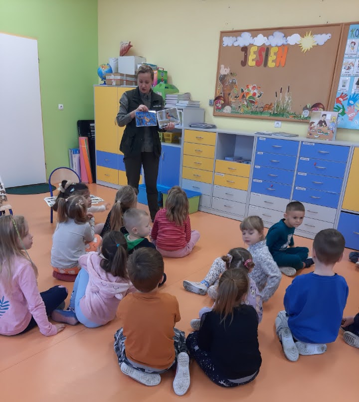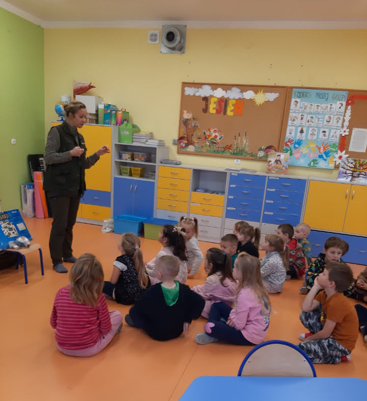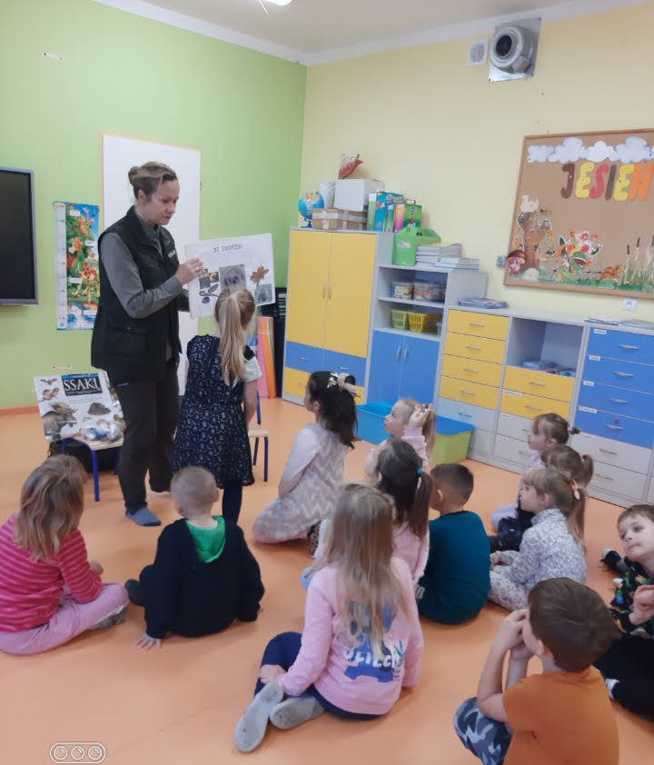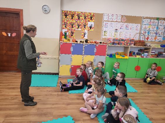 Przedszkolaki ze wszystkich grup przedszkolnych odwiedziła Pani Irena Dziadoń pracująca jako leśnik w Nadleśnictwie Srokowo. Celem spotkania było zapoznanie dzieci z pracą leśnika, kształtowanie podstawowych zasad ochrony przyrody, poznanie wiadomości na temat zwierząt żyjących w środowisku leśnym. Przedszkolaki z dużym zainteresowaniem słuchały o zmianach zachodzących jesienią w przyrodzie. Poznały nazwy zwierząt żyjących w lesie i jak należy się zachowywać w kontakcie z nimi. Nie zabrakło też informacji o przygotowaniach zwierząt do zimy i wiadomości, które z nich zapadają w sen zimowy. Pani leśnik przypomniała również zasady zachowania się w lesie (m.in. zachowanie ciszy, porządku, unikanie kontaktu z dzikimi zwierzętami). Opowiedziała również o specyfice swojej pracy.