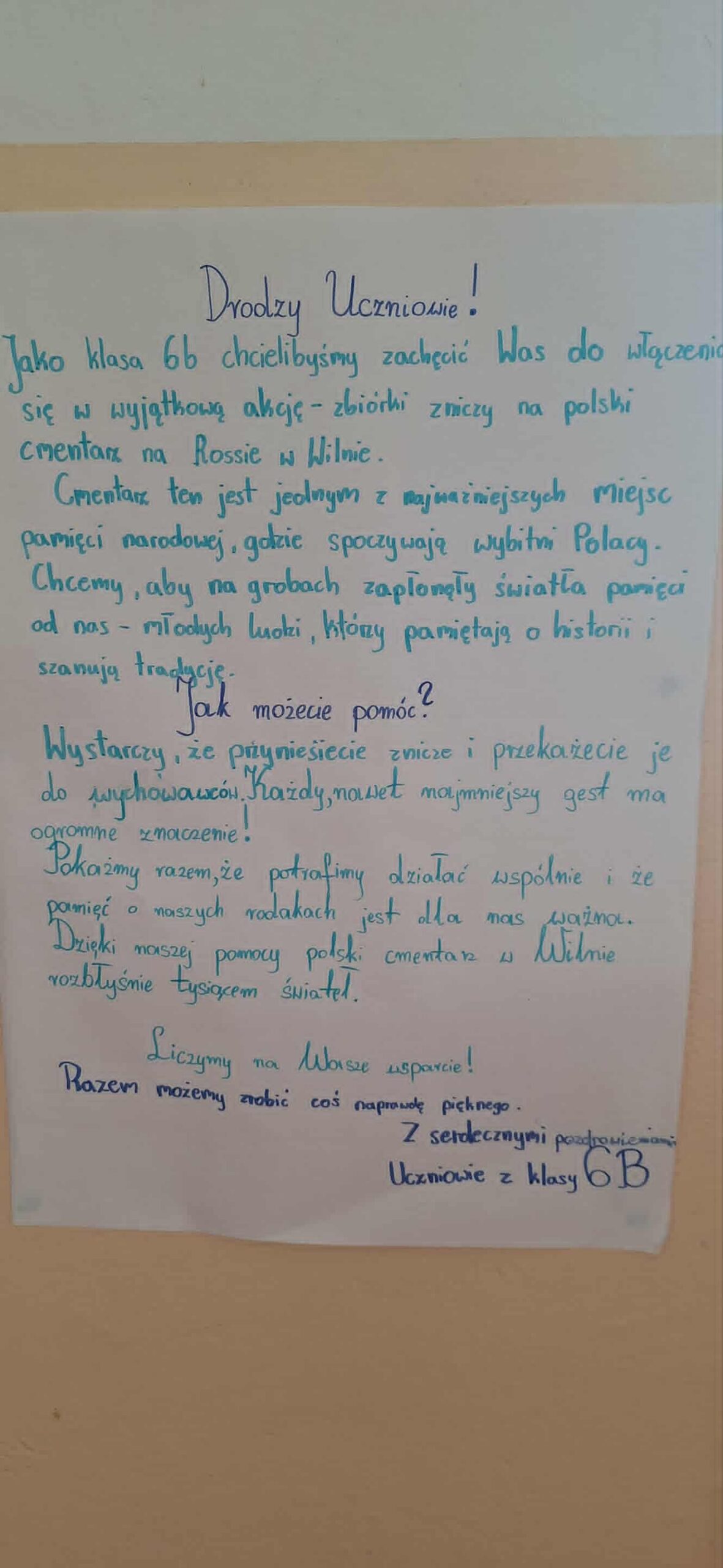 Cmentarz na Rossie jest nie tylko miejscem spoczynku wybitnych Polaków, ale przede wszystkim jednym z najważniejszych symboli naszej pamięci narodowej poza granicami kraju. Uczniowie klasy 6 b chcą pokazać, że jako młode pokolenie pamiętamy o historii i szanujemy tradycję. Ich celem jest to, aby na grobach w Wilnie, dzięki naszej wspólnej pomocy, zapłonęły światełka podarowane od nas – młodych ludzi.