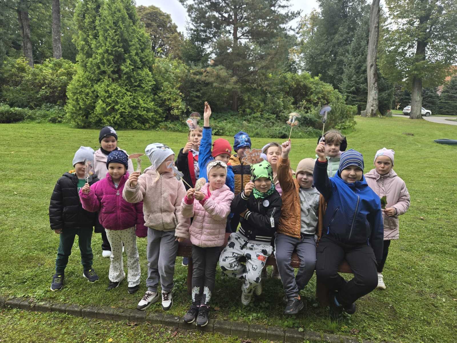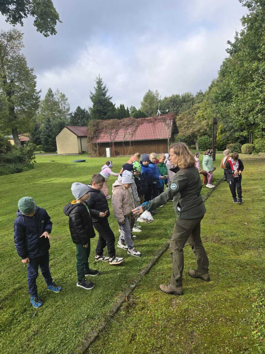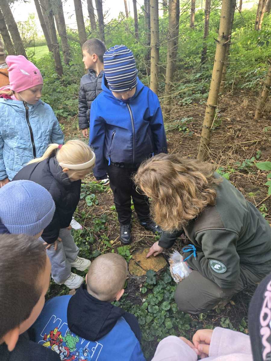 Następnie odbyły się zajęcia terenowe, podczas których uczniowie rozpoznawali jesienne drzewa po liściach oraz szukali „grzybów” – papierowych makiet grzybów jadalnych i niejadalnych, rozmieszczonych wcześniej w lesie przez panią leśnik. Każde znalezisko było omawiane wspólnie, co pozwoliło na utrwalenie wiedzy przyrodniczej.