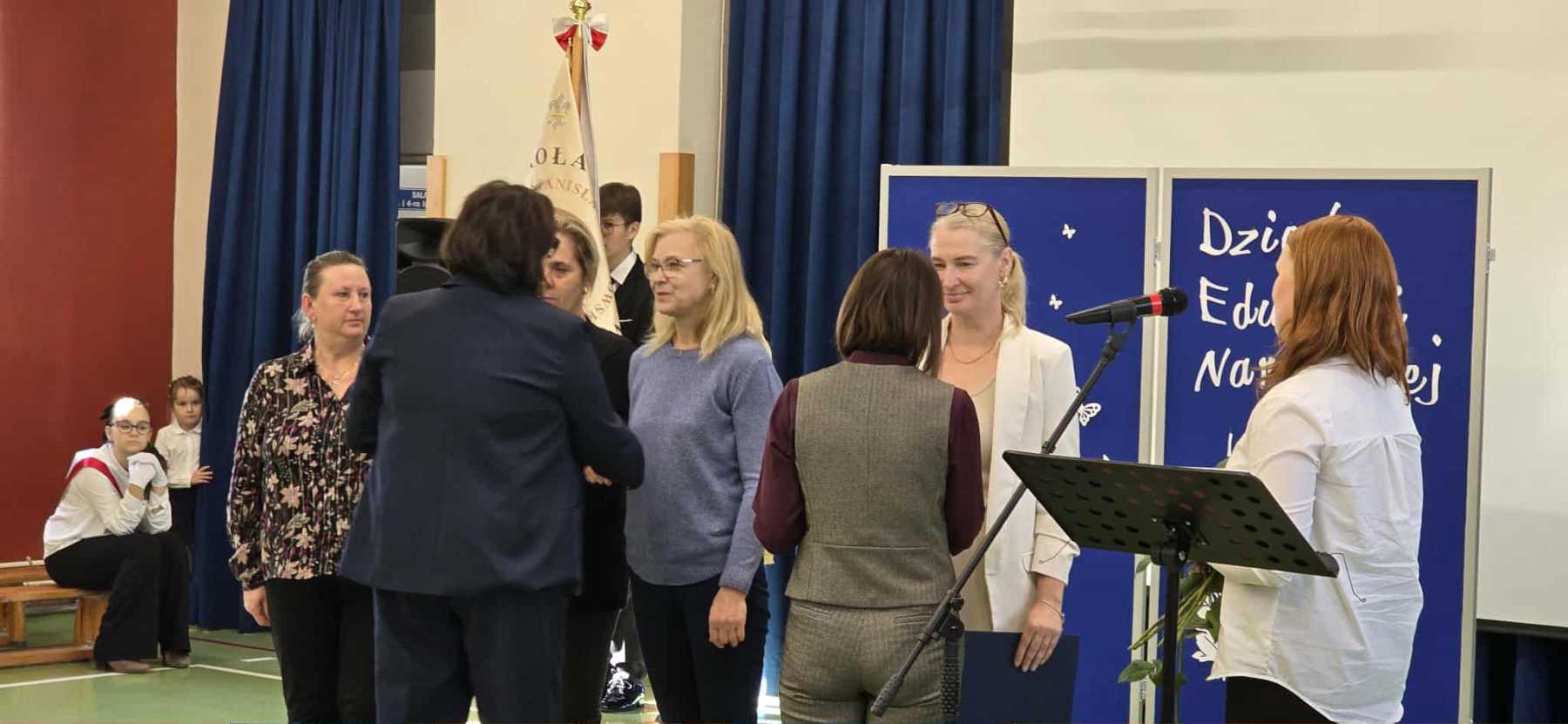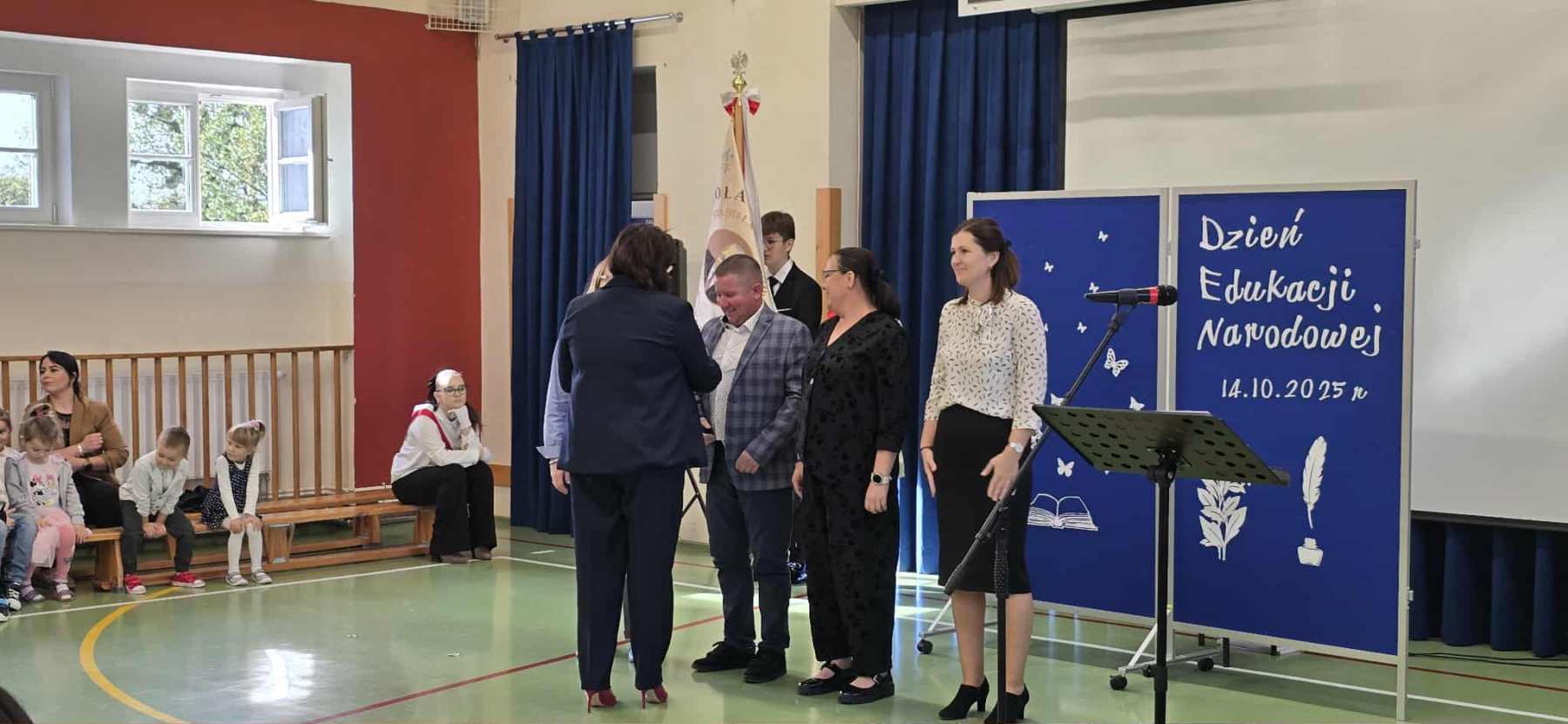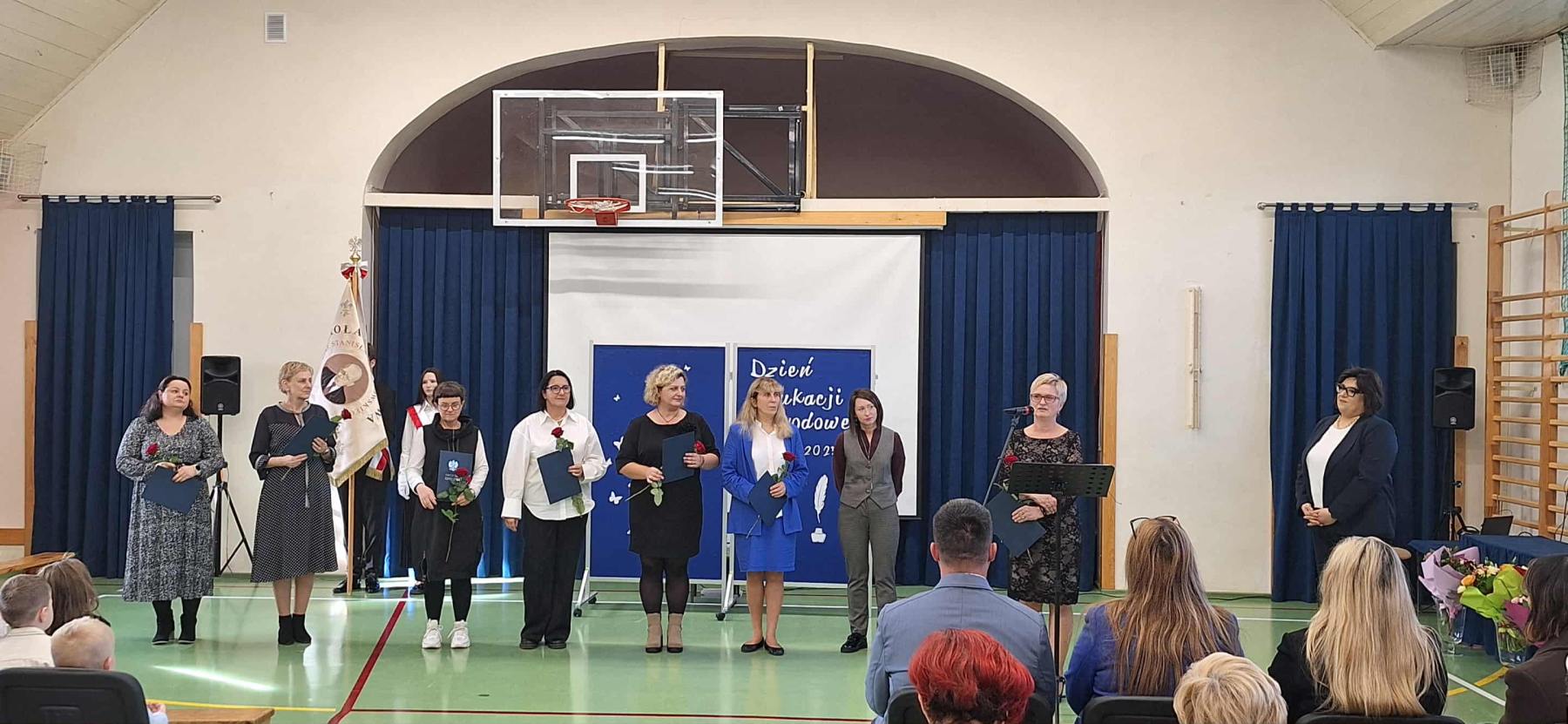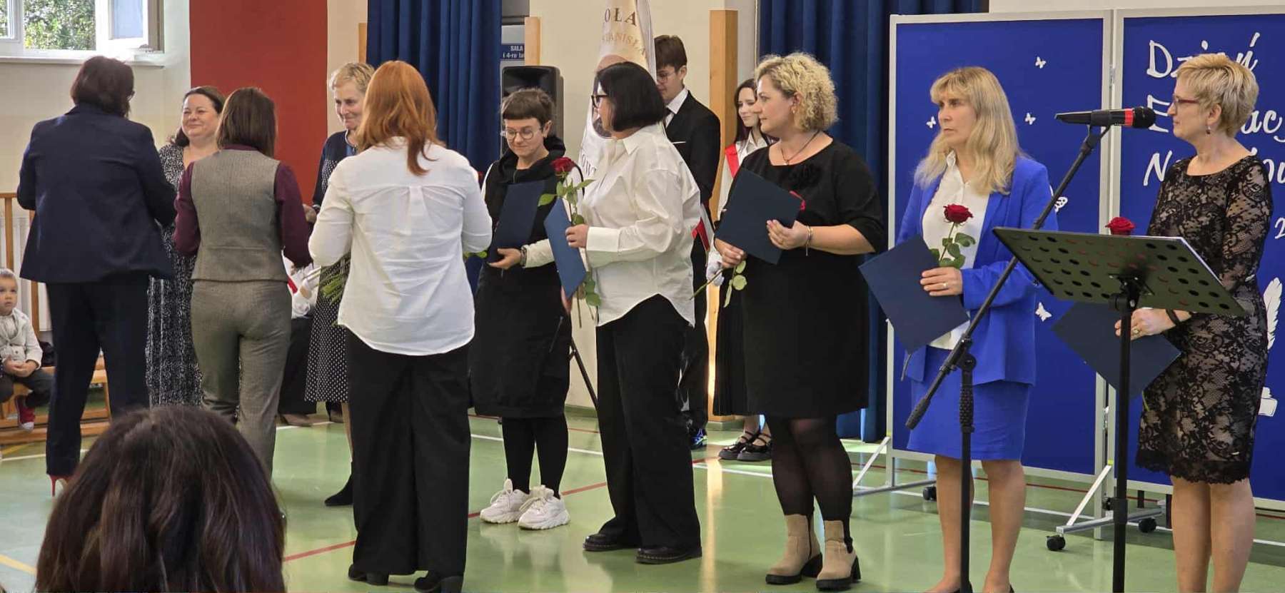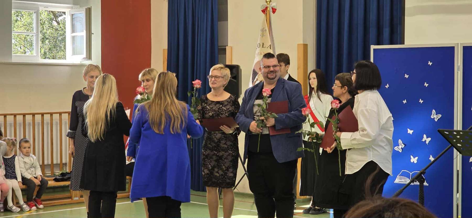 Następnie głos zabrała Pani Wójt Katarzyna Sadowska, która przekazała życzenia całej społeczności szkolnej, a także wyraziła uznanie dla nauczycieli i pracowników szkoły za ich wkład w rozwój edukacji w gminie. W dalszej części uroczystości Pani Wójt wręczyła nagrody dla wyróżniających się nauczycieli i pracowników szkoły, doceniając ich pasję i oddanie. Byli to: pani Beata Beyer, pani Daria Oryńczak, pani Anna Boroch, pani Agata Jankowska, pani Danuta Mudryk oraz pan Zbigniew Mirocha. Ponadto, w ramach podziękowań każdy nauczyciel otrzymał symboliczną różę od Pani Wójt.