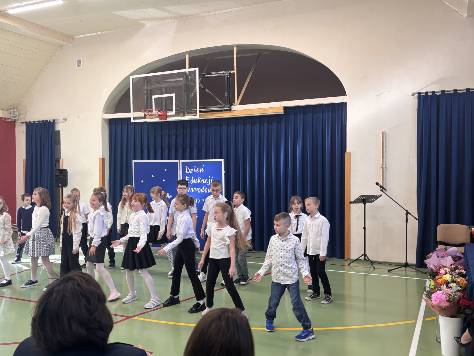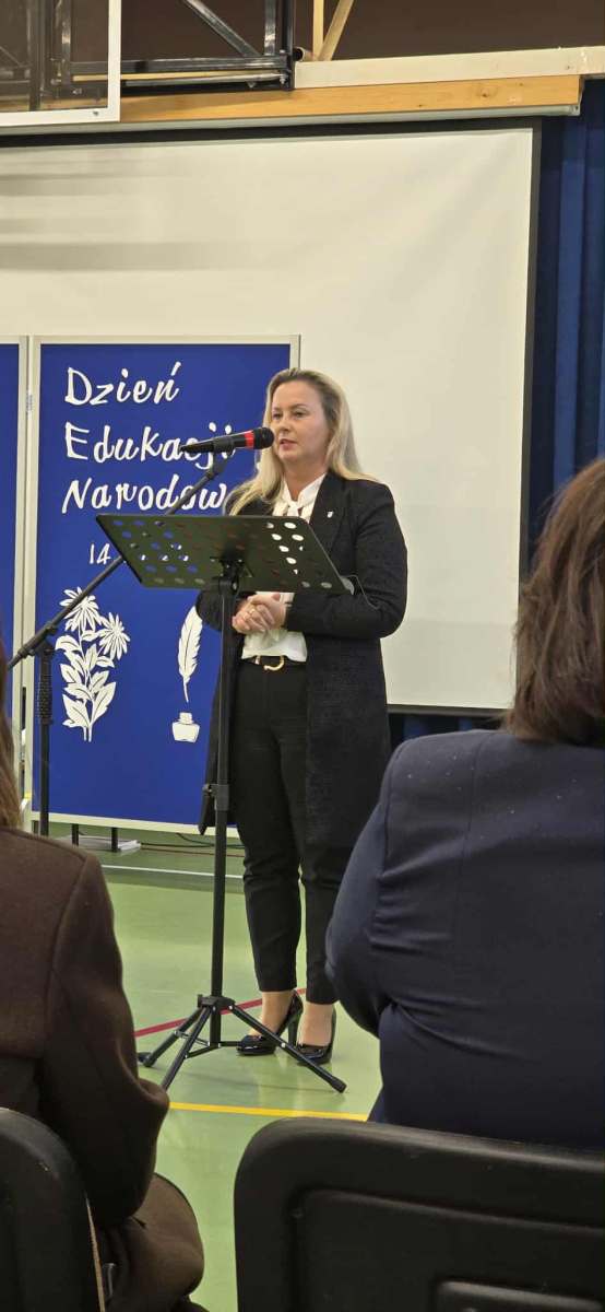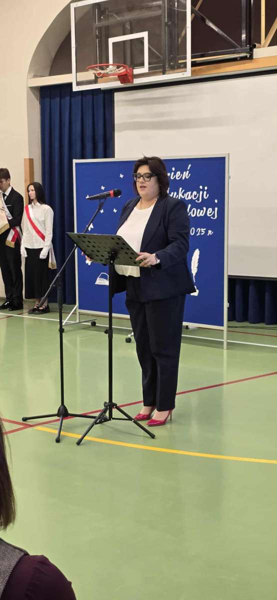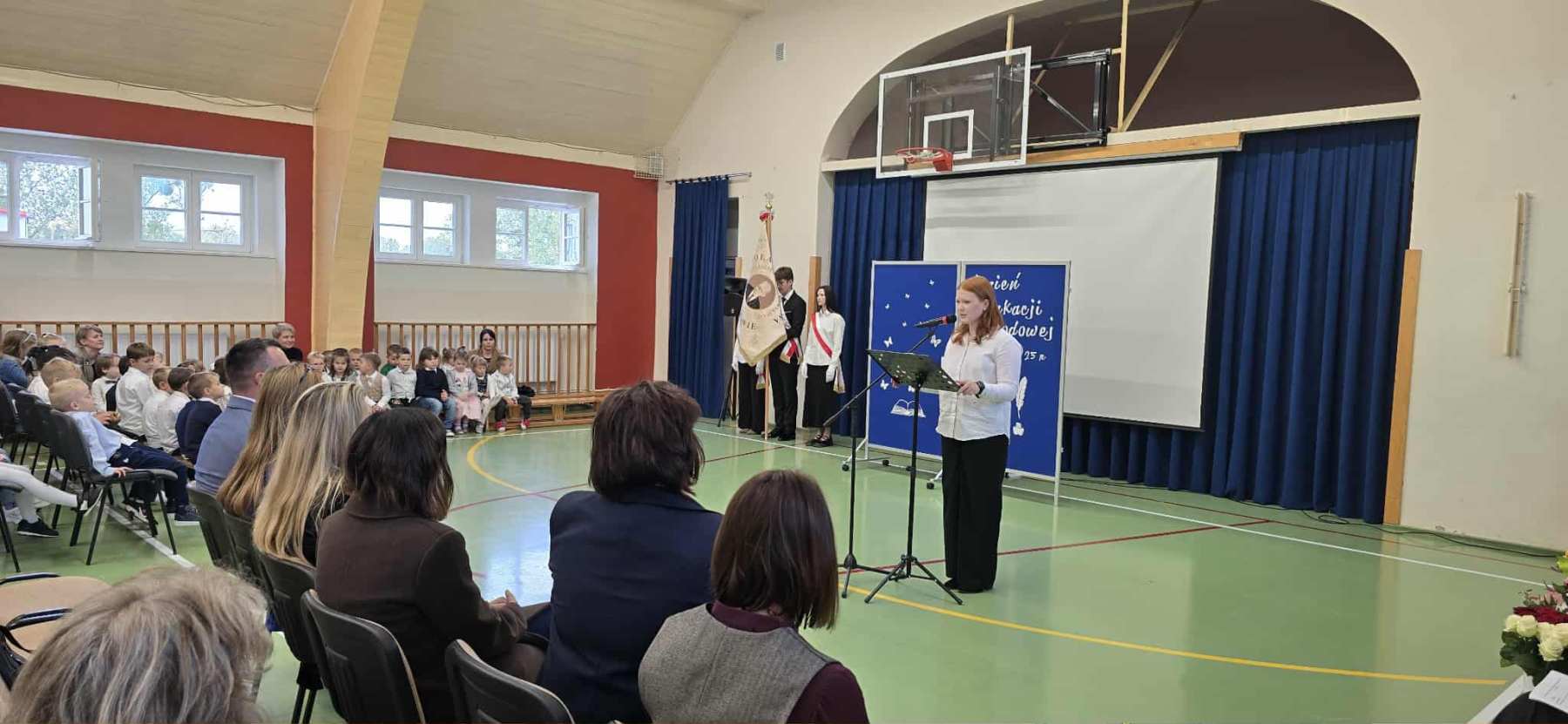 Uroczystość, którą poprowadził samorząd uczniowski, rozpoczęła się o godzinie 10:45 w sali gimnastycznej. Zgromadzonych uczniów, nauczycieli, pracowników szkoły oraz zaproszonych gości powitała Pani Dyrektor Karolina Andruszkiewicz-Kukuła. W swoim wystąpieniu podkreśliła znaczenie pracy nauczyciela i wszystkich pracowników szkoły w kształtowaniu postaw i wartości młodego pokolenia. Złożyła również serdeczne życzenia z okazji ich święta, dziękując za codzienny trud, cierpliwość i zaangażowanie.