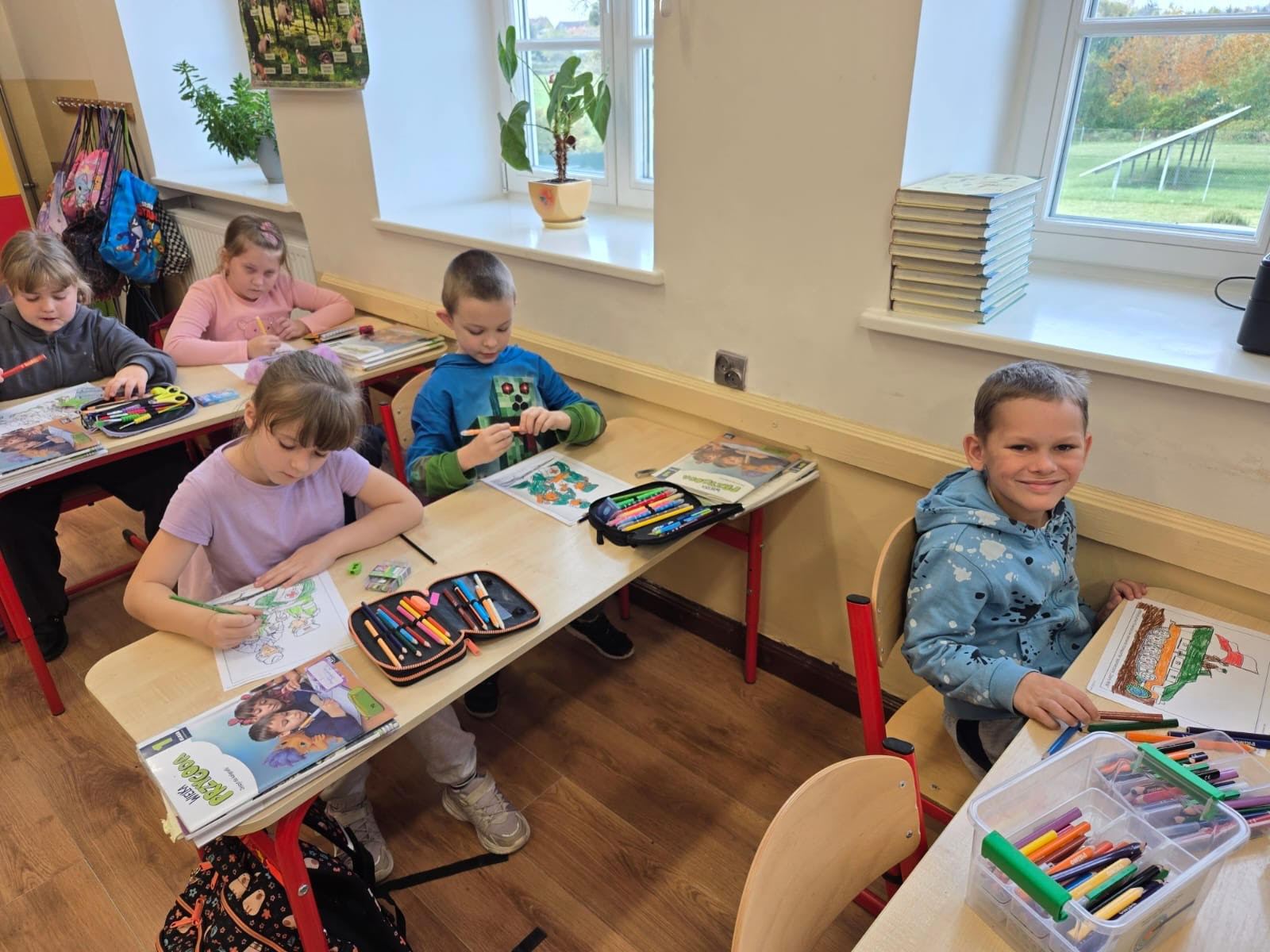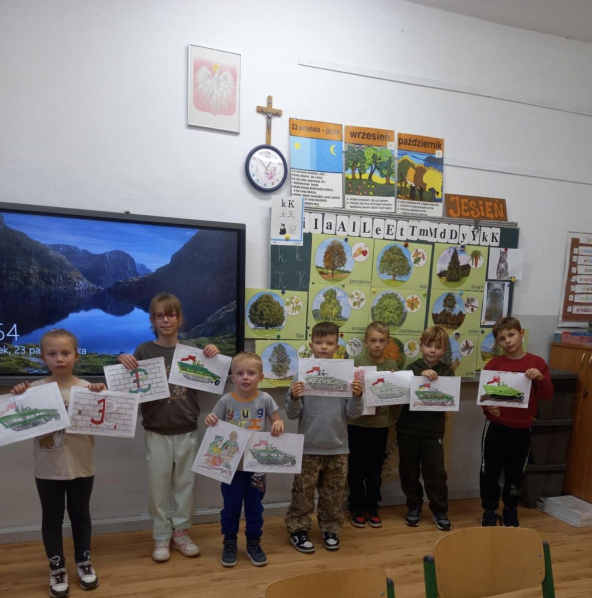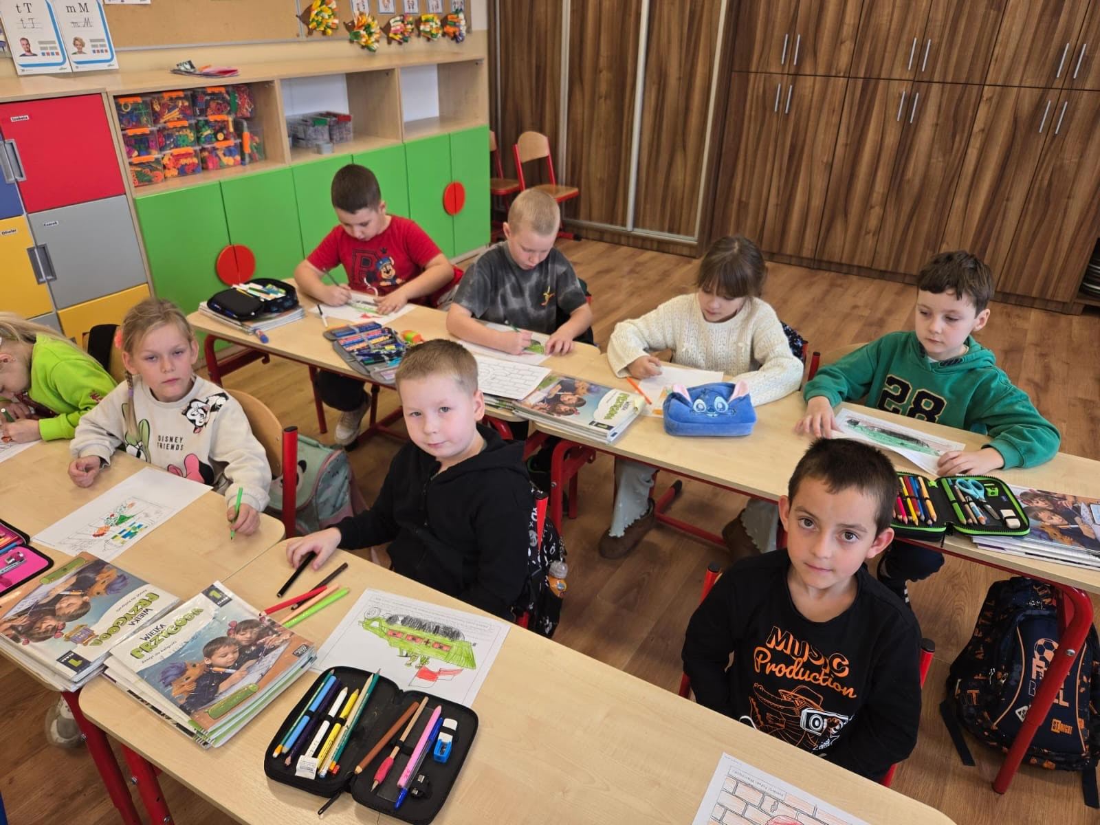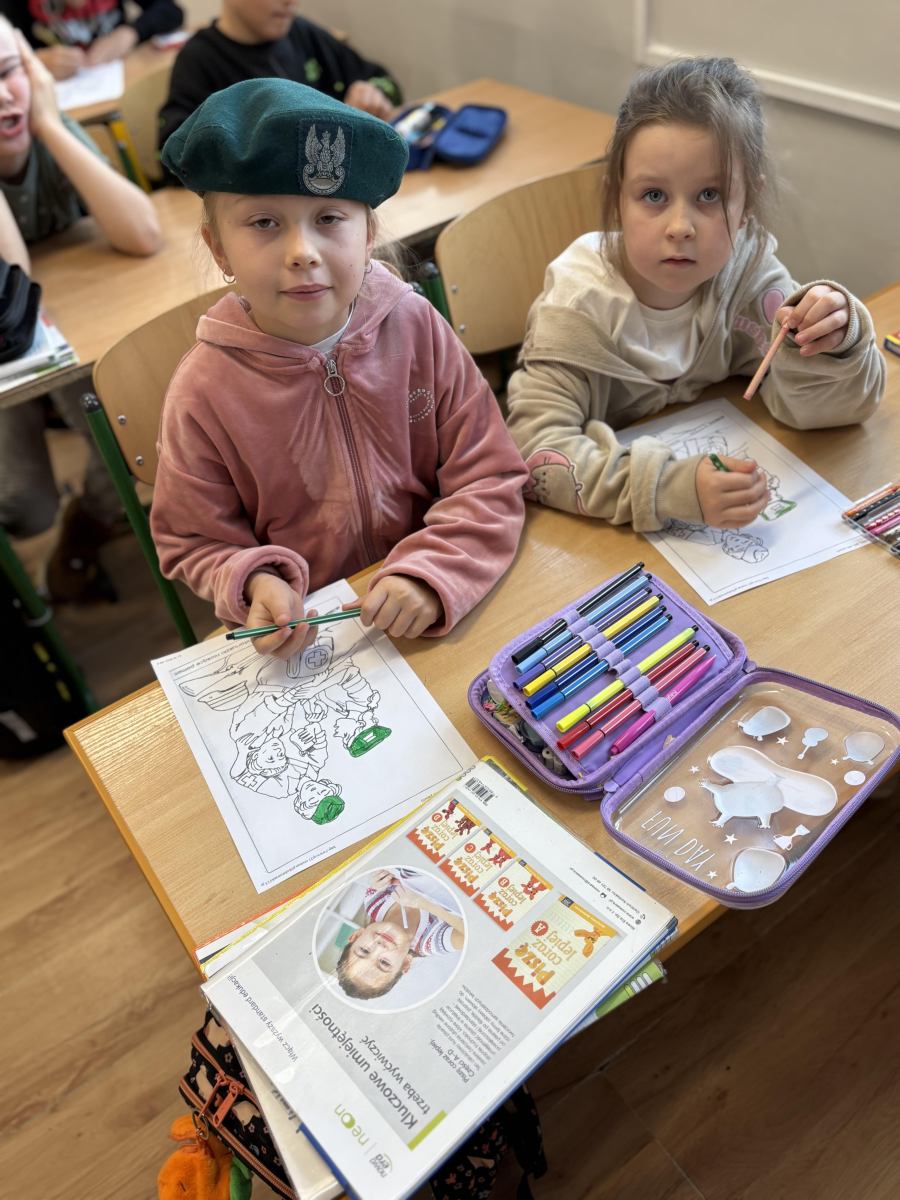 Zajęcia rozpoczęły się od wspólnego oglądania materiału wideo „Powstańcze Dziewczyny– o rolach kobiet w Powstaniu Warszawskim” przygotowany przez nauczycielkę-bibliotekarkę znaną jako BiblioPatika, z podkreśleniem szczególnej uwagi na wygląd i zadania kobiet w nagraniu. Nauczyciel zachęcał dzieci do aktywnego udziału poprzez pytania o funkcje powstańczyń, takie jak sanitariuszka, łączniczka czy listonoszka. Dzieci poznały zadania dziewcząt i kobiet podczas Powstania Warszawskiego – od opatrywania ran, przenoszenia meldunków, po pracę w kuchni polowej i organizację chwil wytchnienia na barykadach, jak teatr czy muzyka. Omówił także charakterystyczny strój powstańczyń: od wojskowych furażerek i czapek harcerskich, przez biało-czerwone opaski, po torby medyczne z czerwonym krzyżem. Dzieci dowiedziały się, jak powstańczynie ukrywały się przed patroli niemieckich, wychodząc w codziennych ubraniach i marzyły o zdobycznych kombinezonach wojskowych. Podczas zajęć dzieci zadawały wiele ciekawych pytań, które pokazały ich zaangażowanie i chęć głębszego zrozumienia tematu. Zastanawiały się między innymi: • Jak młode dziewczęta radziły sobie w tak trudnych warunkach powstania? • Czy bały się walczyć i jak pokonywały strach? Dzieci były także zaskoczone faktem, że jedna z najmłodszych sanitariuszek Różyczka Goździewska miała niecałe 9 lat– pokazało to, jak wielka była ich odwaga i determinacja, nawet w tak młodym wieku. Ta ciekawostka mocno zapadła w pamięć i wzbudziła podziw dla bohaterek tamtych czasów. Na zakończenie dzieci mogły praktycznie poznać techniki bandażowania i pokolorować przygotowane rysunki przedstawiające między innymi małą sanitariuszkę Różę i zdobyczny czołg „Panthera”, co dodatkowo angażowało i utrwalało wiedzę. Lekcja spotkała się z ogromnym zainteresowaniem i ciekawością, pokazując, że historia może być fascynująca i dostępna nawet dla najmłodszych.