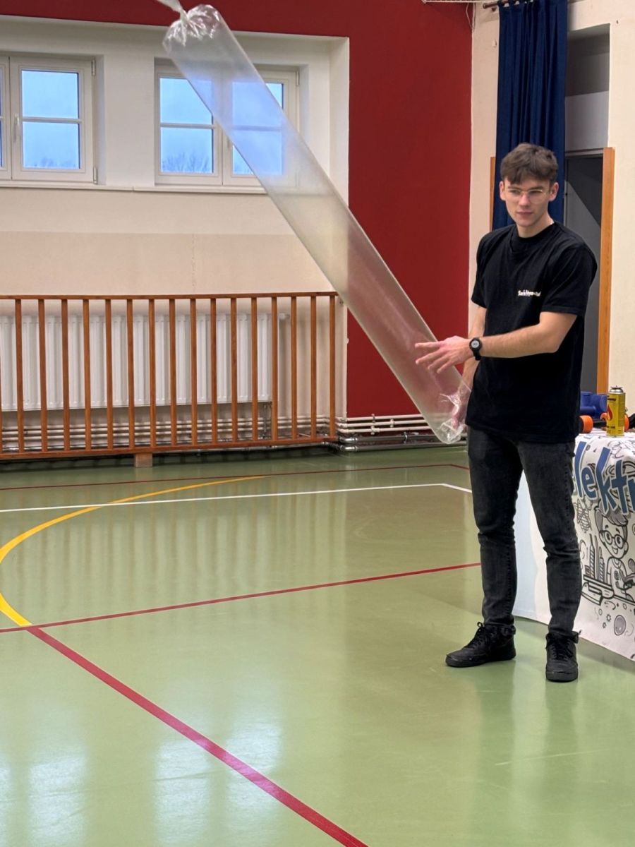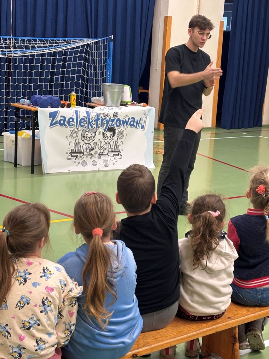 26 listopada 2025 roku w naszej szkole odbyła się niecodzienna lekcja prowadzona przez grupę „Zaelektryzowani”. Chemia i fizyka to nie tylko reguły książkowe, których trzeba się nauczyć, ale to także wiedza praktyczna, która może przydać się nam w życiu codziennym. Celem pokazu  było przybliżenie tajników fizyki i chemii w bardzo prosty i atrakcyjny sposób, zrozumiały dla tych najmłodszych i najstarszych uczniów szkoły. W programie znalazły się zabawy z gazami (ciekły azot, hel, metan), ale również ciekawe zjawiska z fizyki. Różne rekwizyty i substancje sprawiły, że czuliśmy się jak w prawdziwym laboratorium.