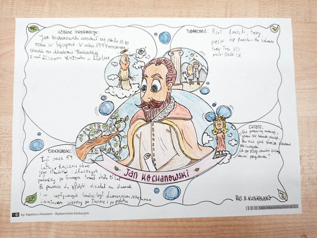 Klasa VIa rozpoczęła projekt od poznania życia i twórczości Jana Kochanowskiego. Uczniowie uzupełnili Kartę pisarza zawierającą biografię i ciekawostki, a następnie analizowali wybrane utwory: „Na lipę”, „Na zdrowie”, „O żywocie ludzkim”, „Pieśń XIX”, „Tren VIII” oraz fraszkę „Do przyjaciela”. Poznali również pojęcia literackie: fraszka, tren i pieśń.