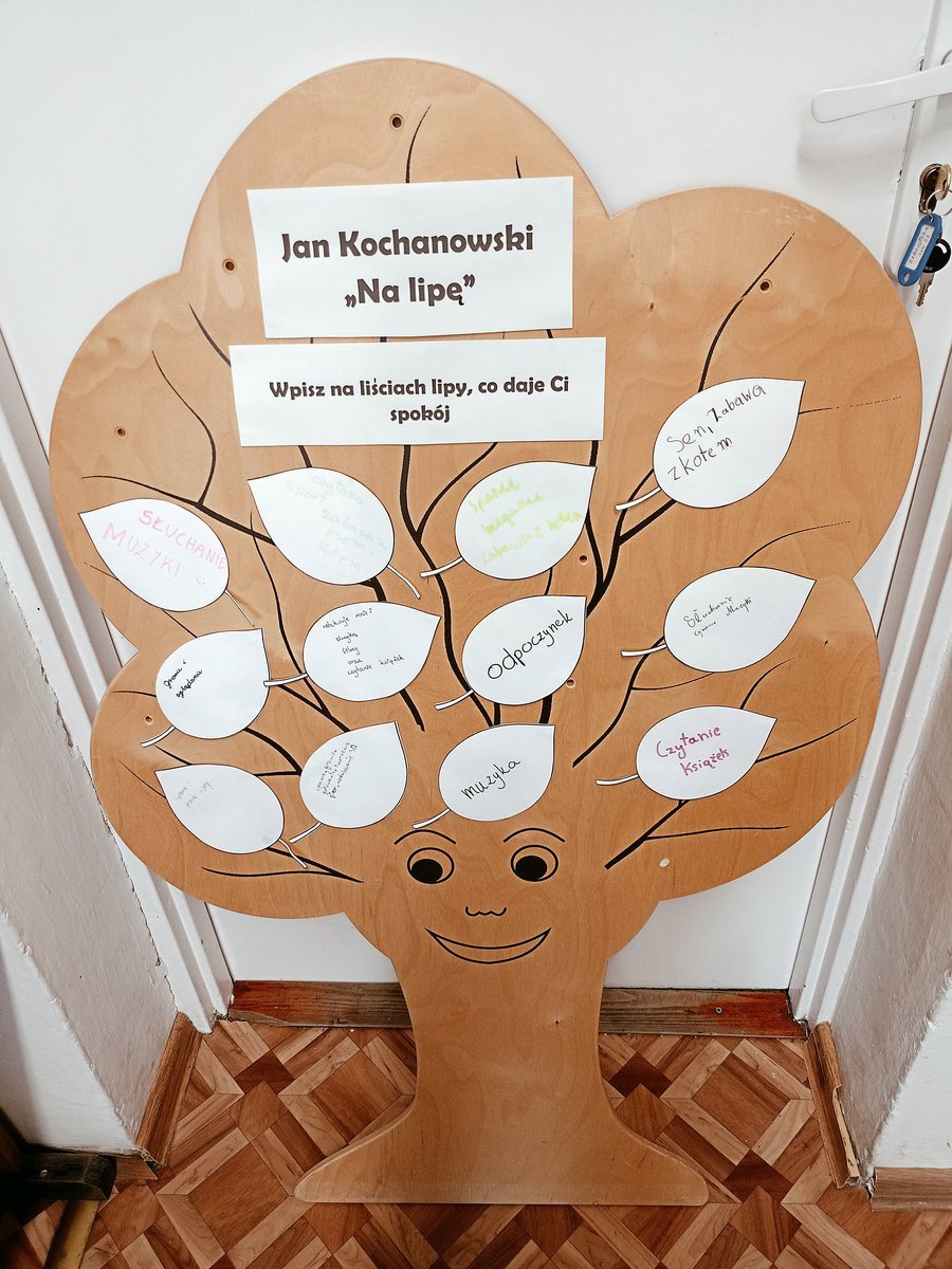 W kolejnej części zajęć wykonali grafonotkę poety, a na koniec stworzyli plakat inspirowany utworem „Na lipę” oraz makietę lipy z listkami opisującymi rzeczy, które przynoszą im spokój i wyciszenie.