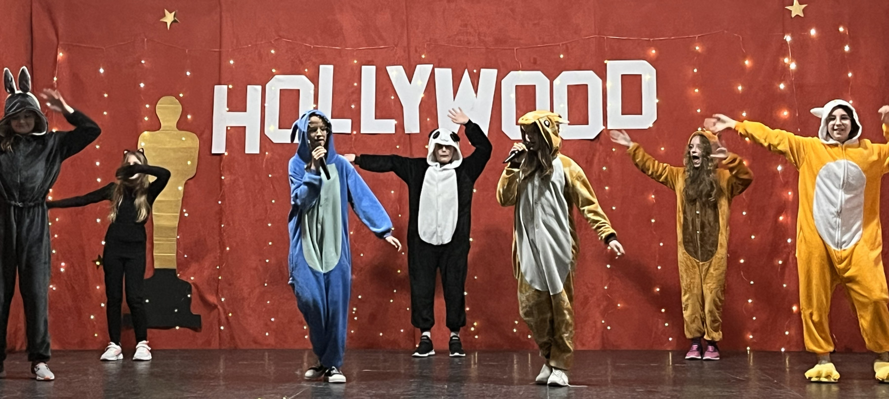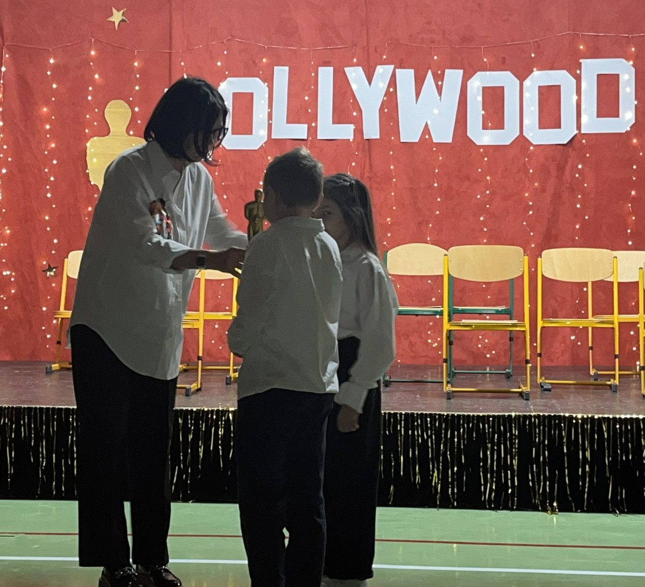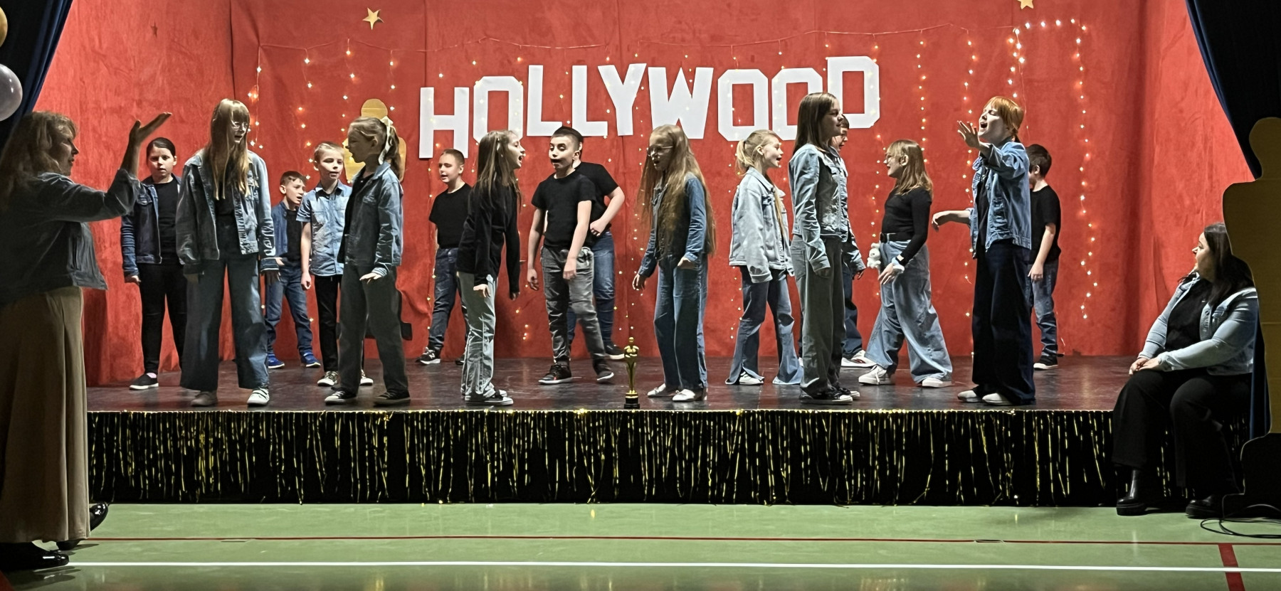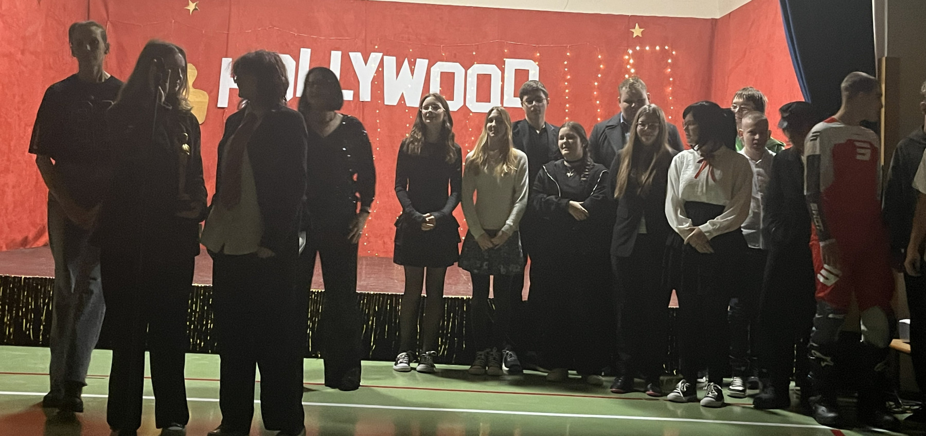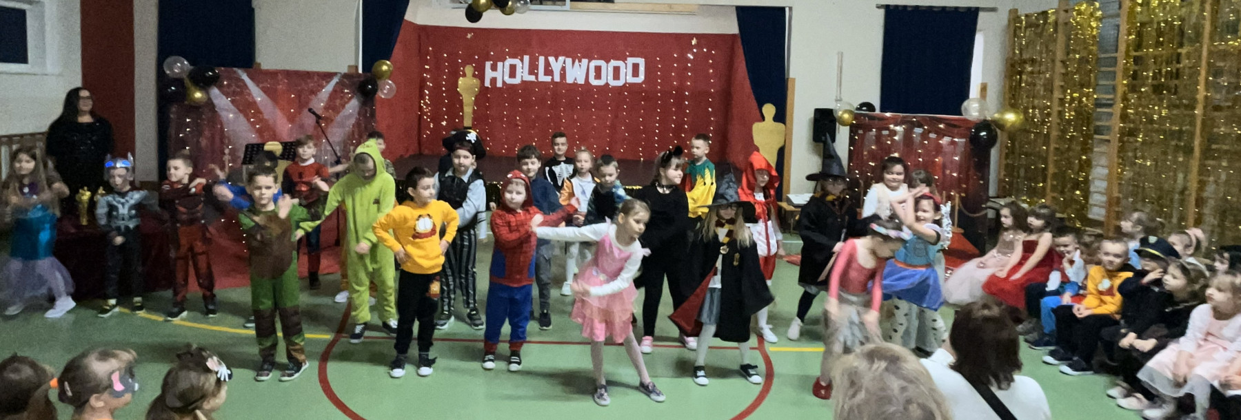 Od samego rana na szkolnych korytarzach panowała niecodzienna atmosfera. Eleganckie stroje uczniów i nauczycieli, liczna obecność rodziców oraz unoszące się w powietrzu zapachy smakołyków zapowiadały niezwykłe wydarzenie. Gdy wszyscy zebrali się w sali gimnastycznej, okazało się, że przenieśliśmy się prosto do Hollywood. O wyjątkowym klimacie świadczyła efektowna dekoracja utrzymana w złocie i czerwieni, blask świateł oraz imponujący napis „Hollywood”, nawiązujący do słynnego symbolu z Kalifornii. Uwagę przyciągały również statuetki Oscarów ustawione w pobliżu sceny.