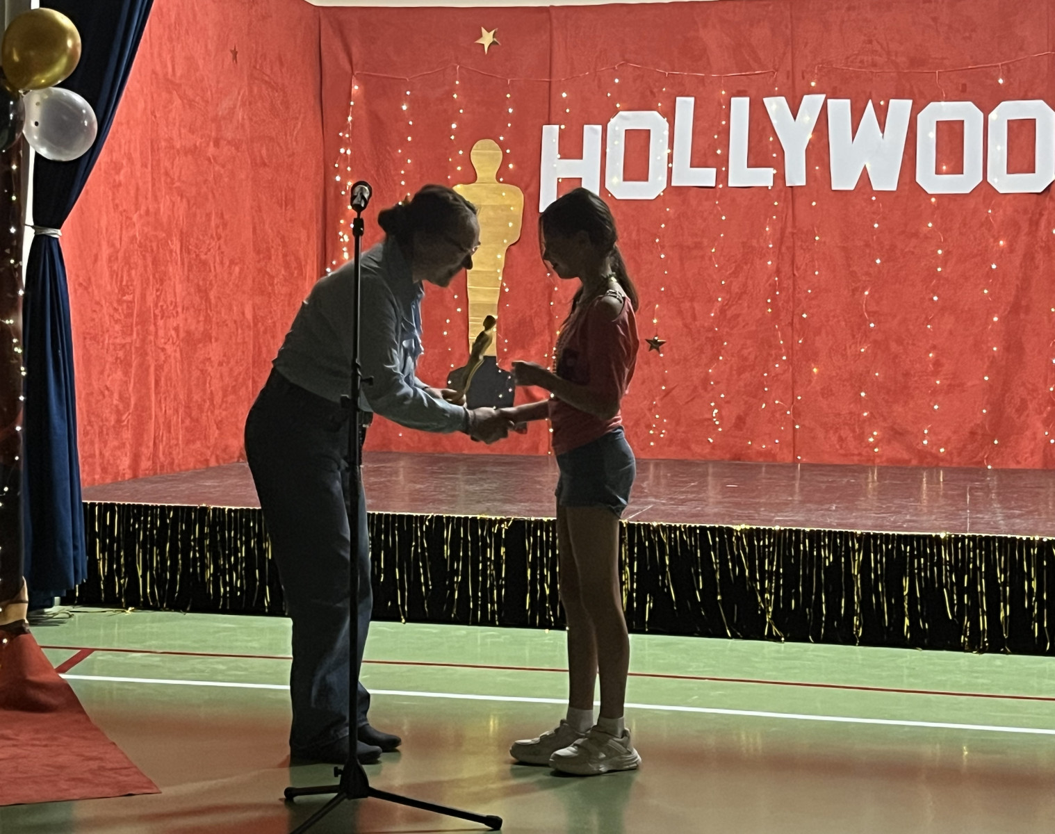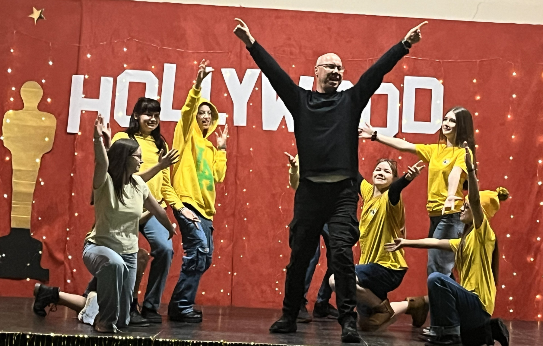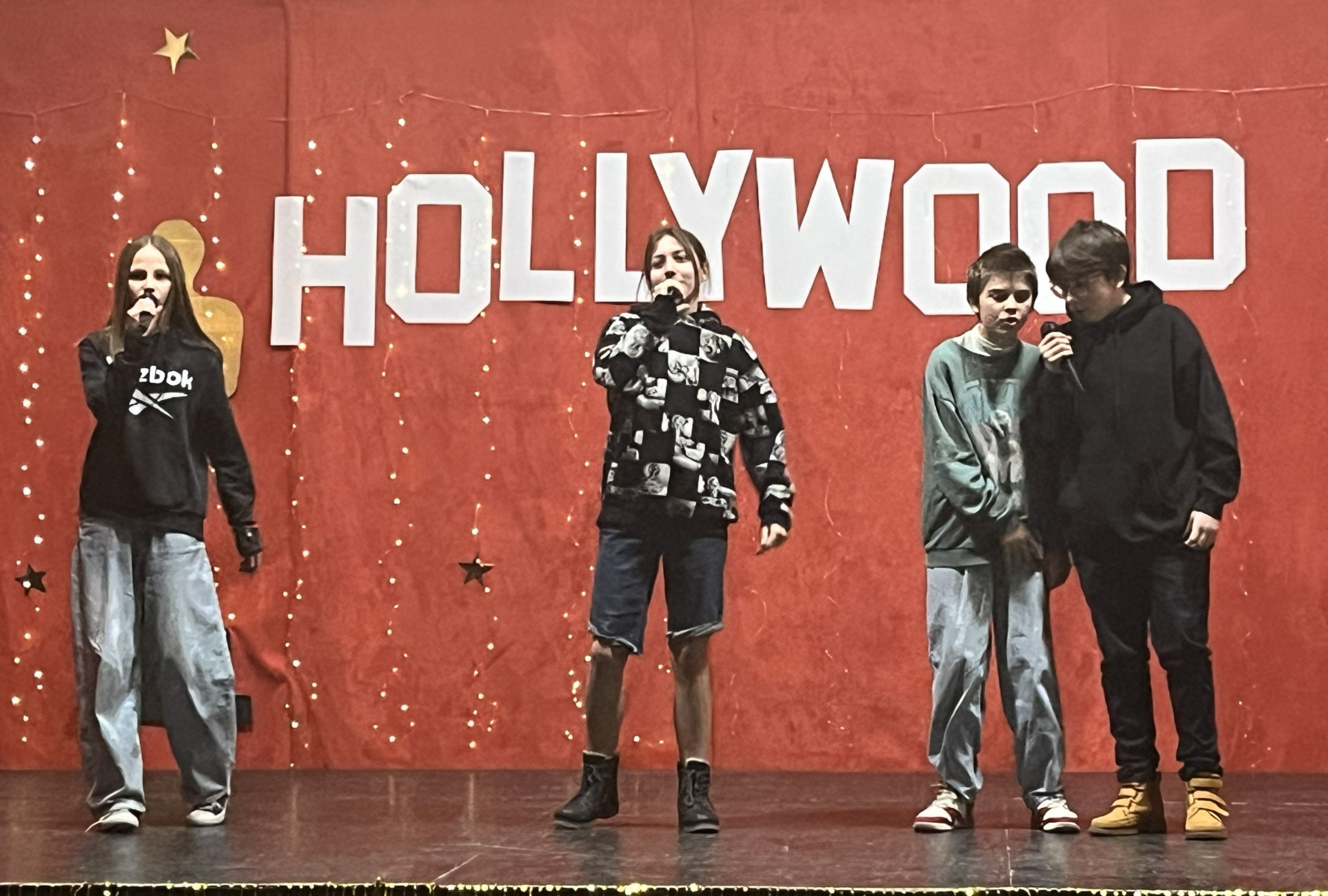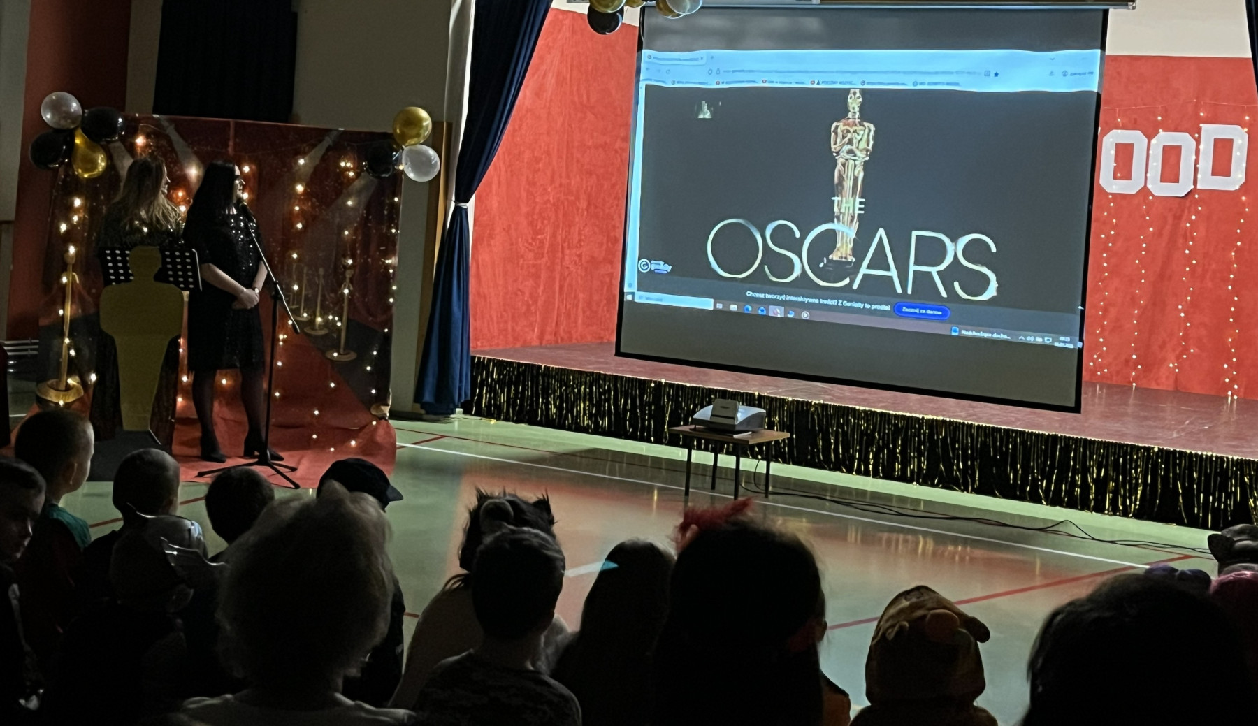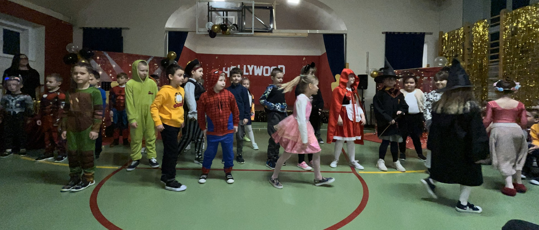 Od samego rana na szkolnych korytarzach panowała niecodzienna atmosfera. Eleganckie stroje uczniów i nauczycieli, liczna obecność rodziców oraz unoszące się w powietrzu zapachy smakołyków zapowiadały niezwykłe wydarzenie. Gdy wszyscy zebrali się w sali gimnastycznej, okazało się, że przenieśliśmy się prosto do Hollywood. O wyjątkowym klimacie świadczyła efektowna dekoracja utrzymana w złocie i czerwieni, blask świateł oraz imponujący napis „Hollywood”, nawiązujący do słynnego symbolu z Kalifornii. Uwagę przyciągały również statuetki Oscarów ustawione w pobliżu sceny.