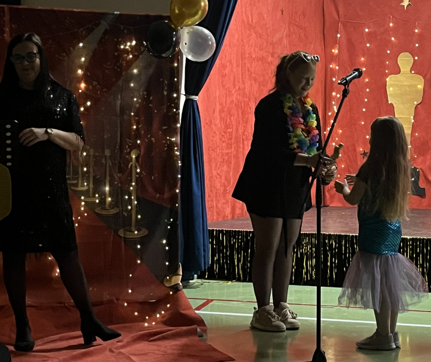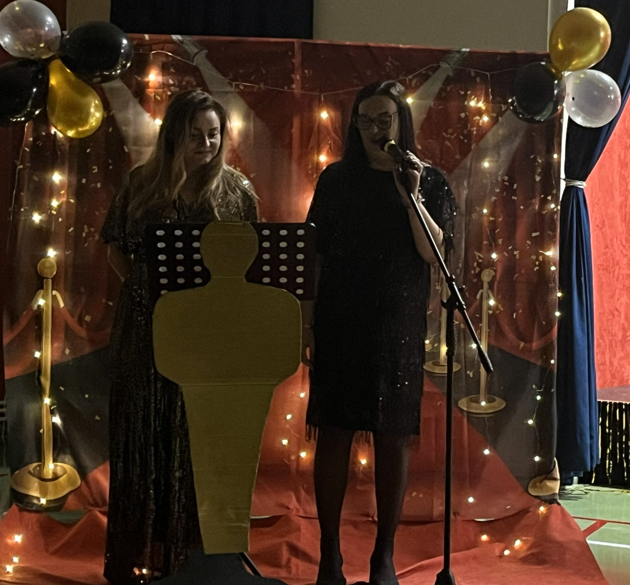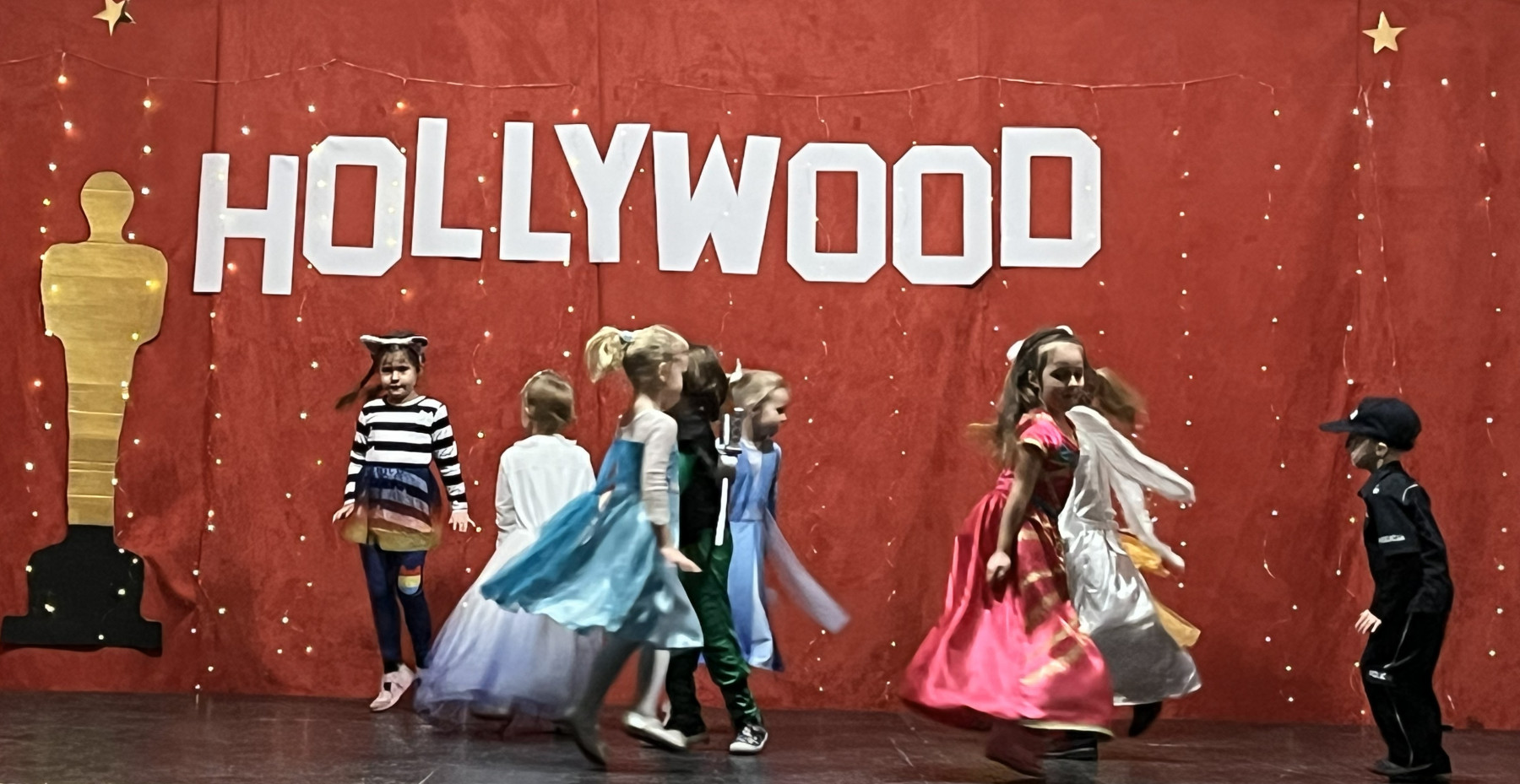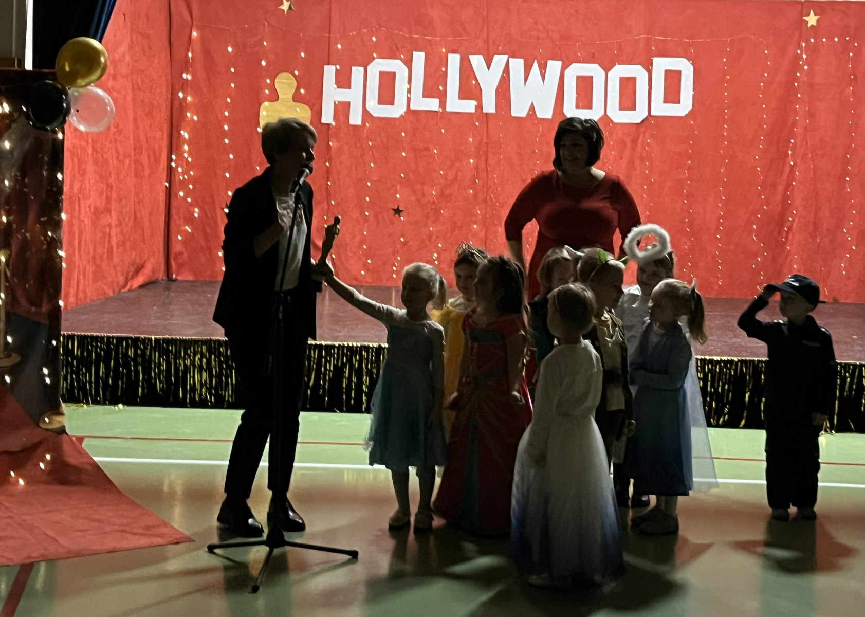 Od samego rana na szkolnych korytarzach panowała niecodzienna atmosfera. Eleganckie stroje uczniów i nauczycieli, liczna obecność rodziców oraz unoszące się w powietrzu zapachy smakołyków zapowiadały niezwykłe wydarzenie. Gdy wszyscy zebrali się w sali gimnastycznej, okazało się, że przenieśliśmy się prosto do Hollywood. O wyjątkowym klimacie świadczyła efektowna dekoracja utrzymana w złocie i czerwieni, blask świateł oraz imponujący napis „Hollywood”, nawiązujący do słynnego symbolu z Kalifornii. Uwagę przyciągały również statuetki Oscarów ustawione w pobliżu sceny.