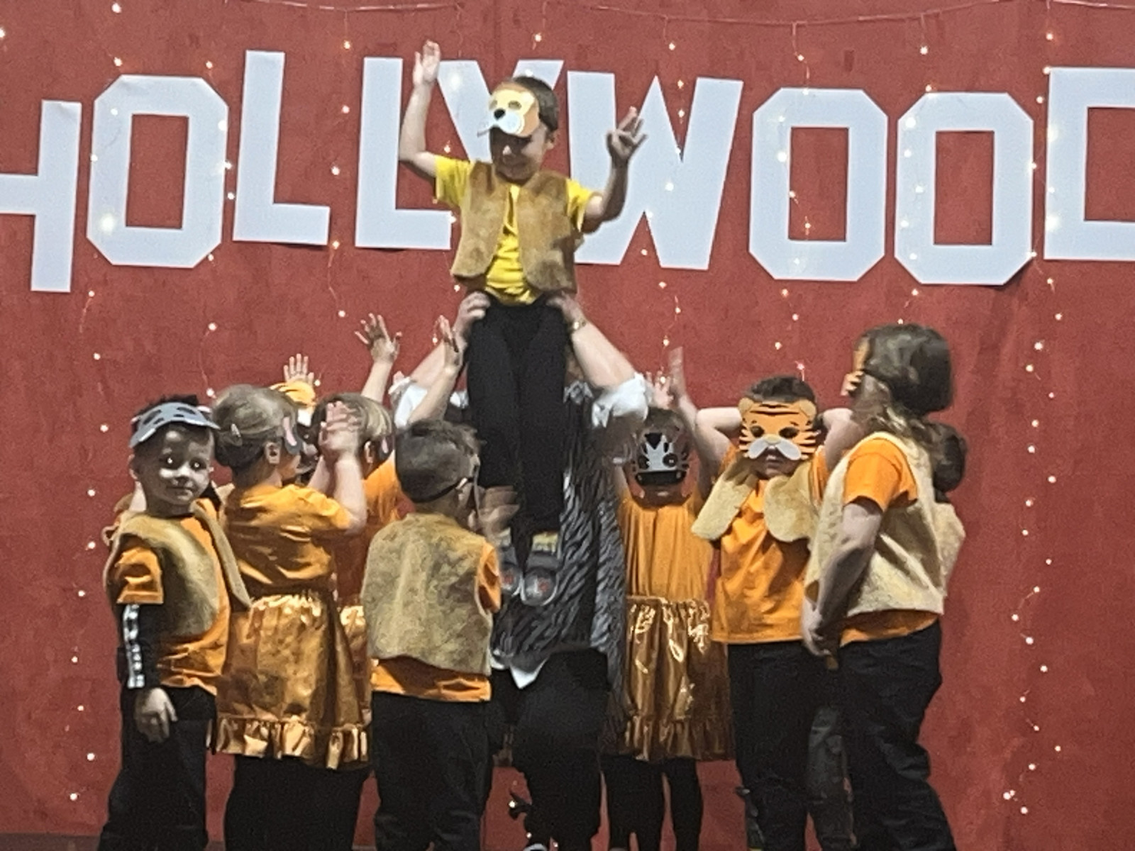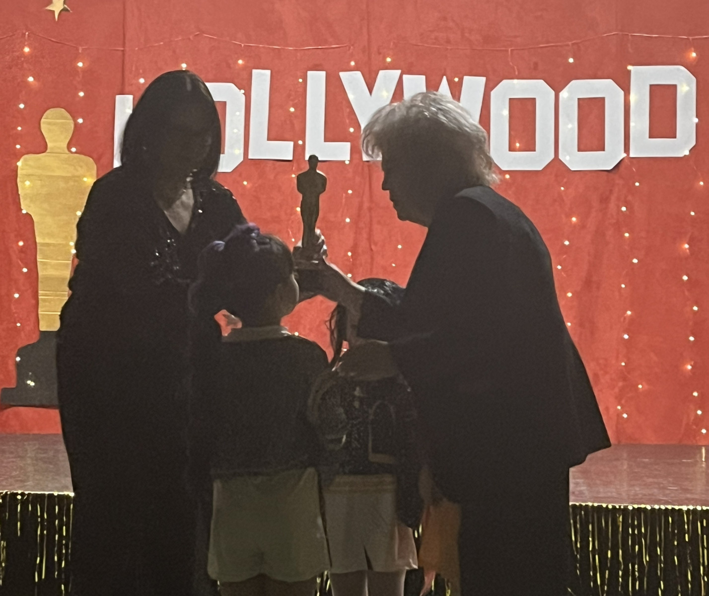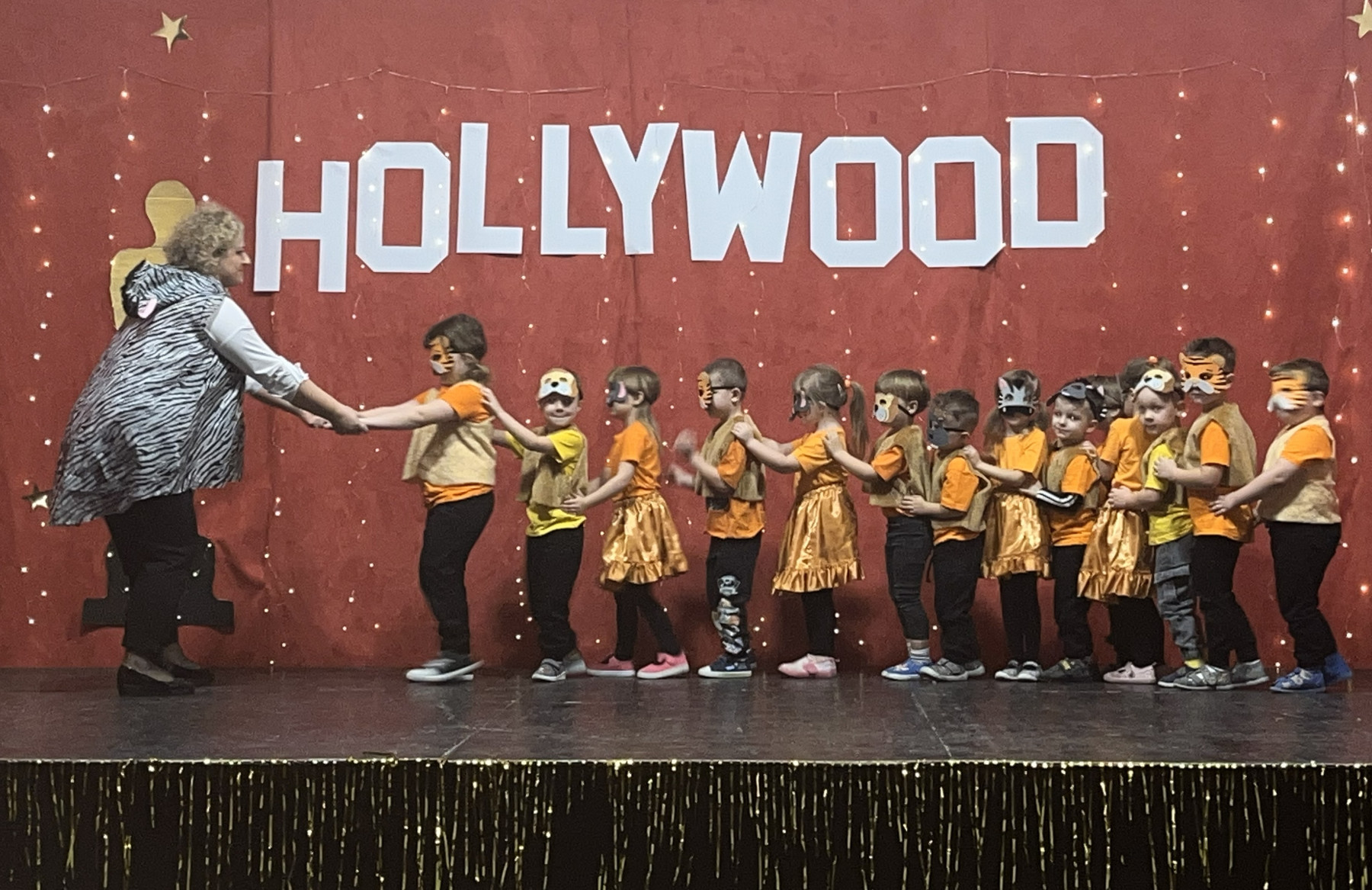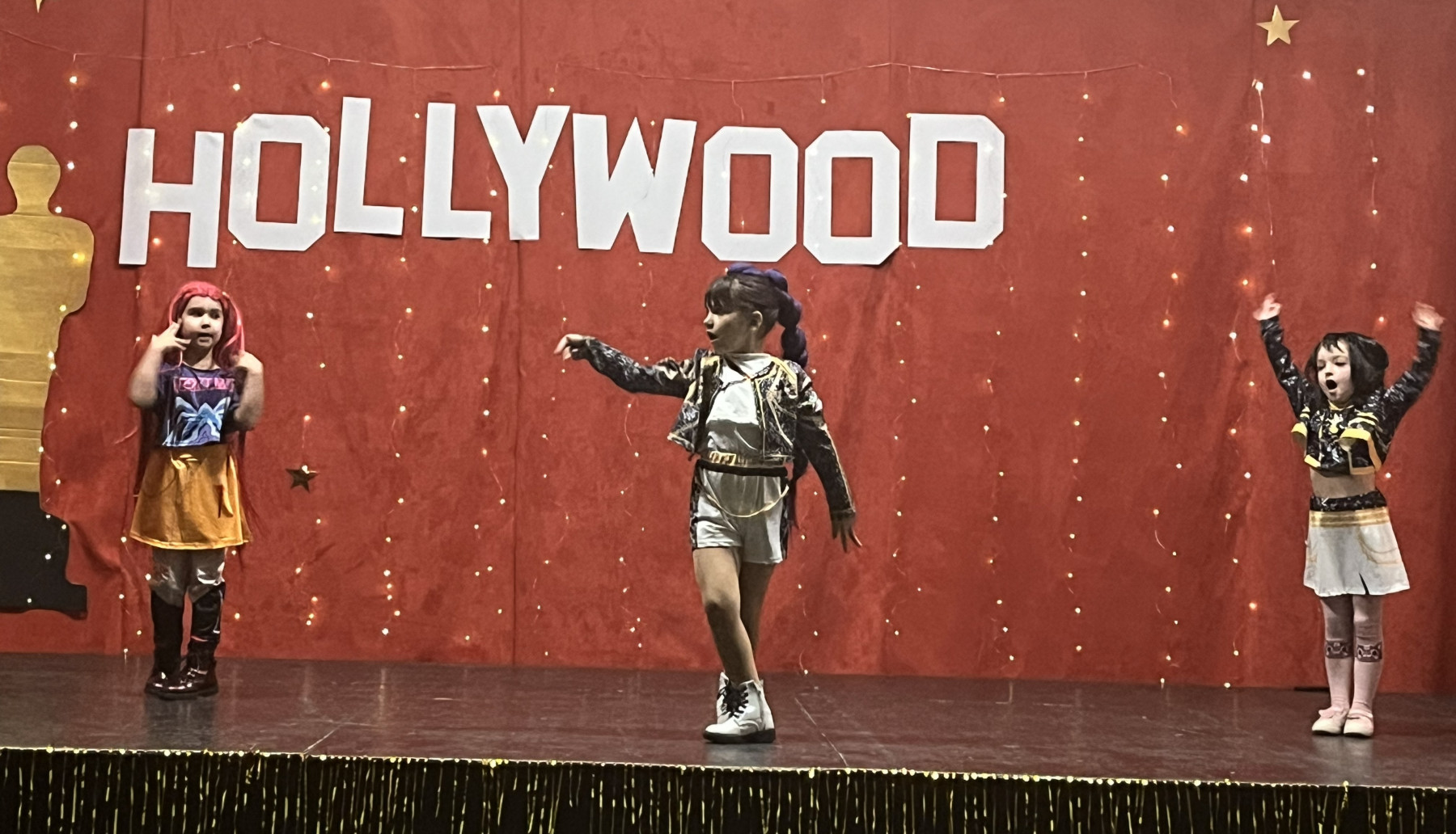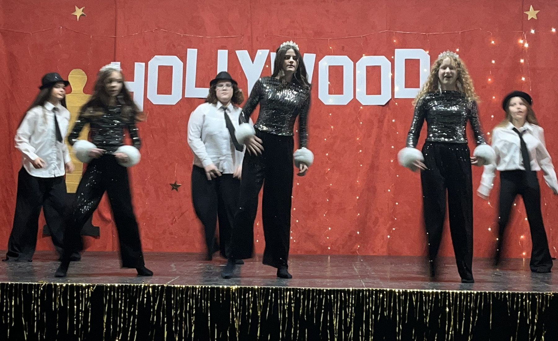 Od samego rana na szkolnych korytarzach panowała niecodzienna atmosfera. Eleganckie stroje uczniów i nauczycieli, liczna obecność rodziców oraz unoszące się w powietrzu zapachy smakołyków zapowiadały niezwykłe wydarzenie. Gdy wszyscy zebrali się w sali gimnastycznej, okazało się, że przenieśliśmy się prosto do Hollywood. O wyjątkowym klimacie świadczyła efektowna dekoracja utrzymana w złocie i czerwieni, blask świateł oraz imponujący napis „Hollywood”, nawiązujący do słynnego symbolu z Kalifornii. Uwagę przyciągały również statuetki Oscarów ustawione w pobliżu sceny.
