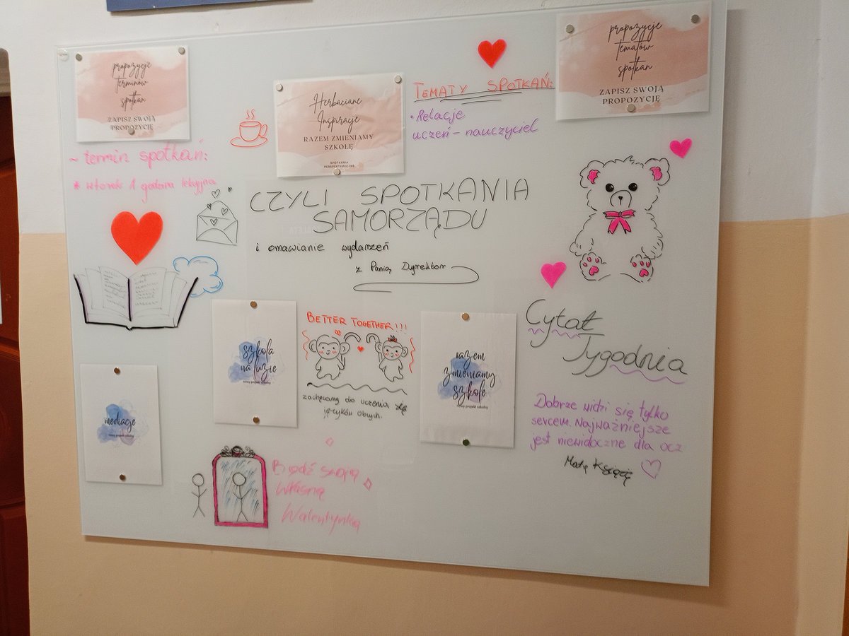 Chcemy, żebyście byli na bieżąco, dlatego przy gabinecie Dyrekcji pojawiła się nasza nowa tablica. To tam znajdziecie najważniejsze ogłoszenia, relacje z akcji i miejsce, gdzie możecie zgłaszać własne pomysły. Dodatkowo przygotowaliśmy dla Was gazetki tematyczne. Od zasad higieny, przez Dzień Życzliwości, aż po klimat świąt.
