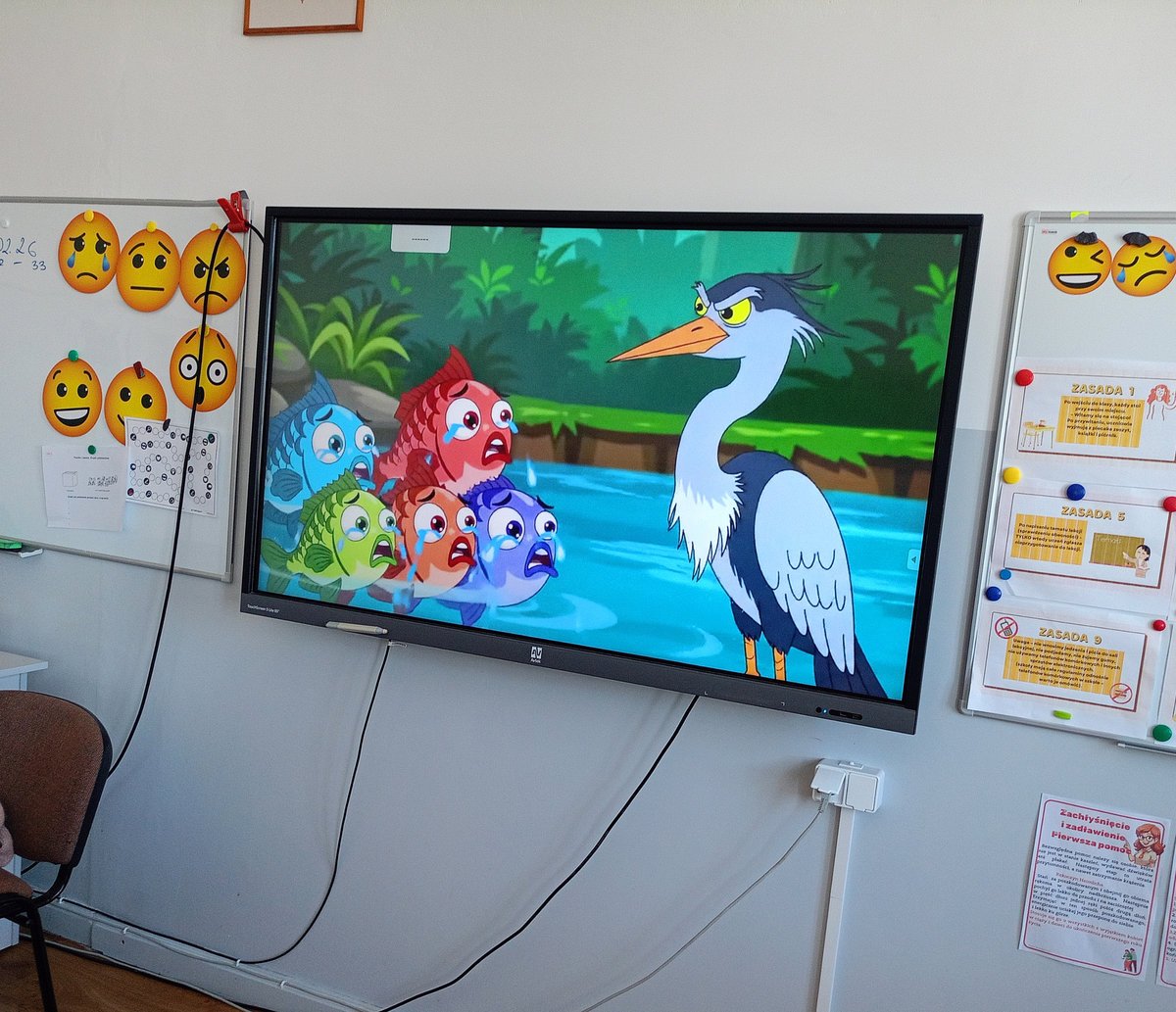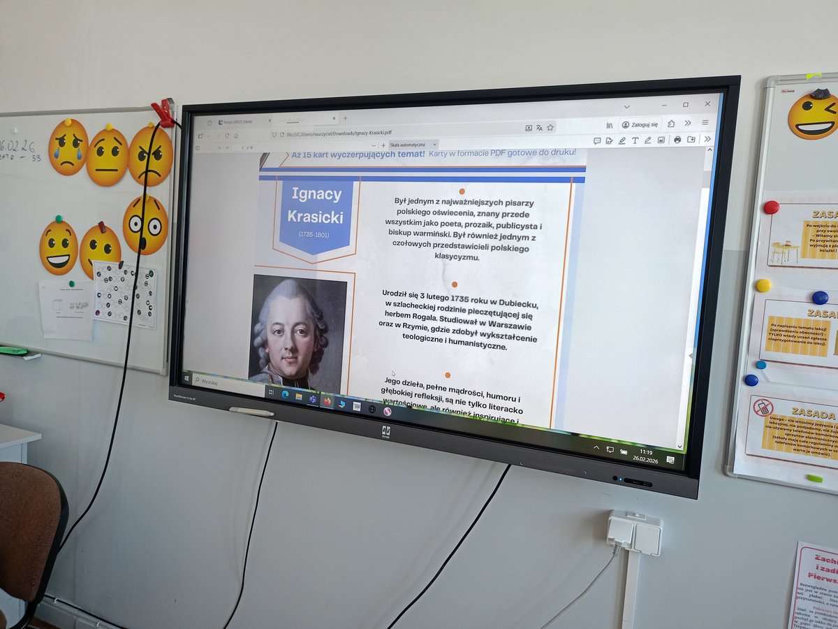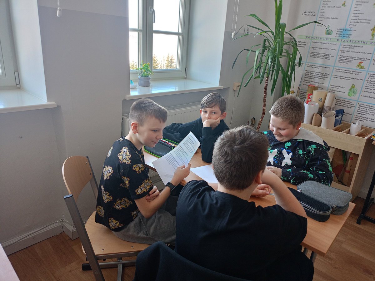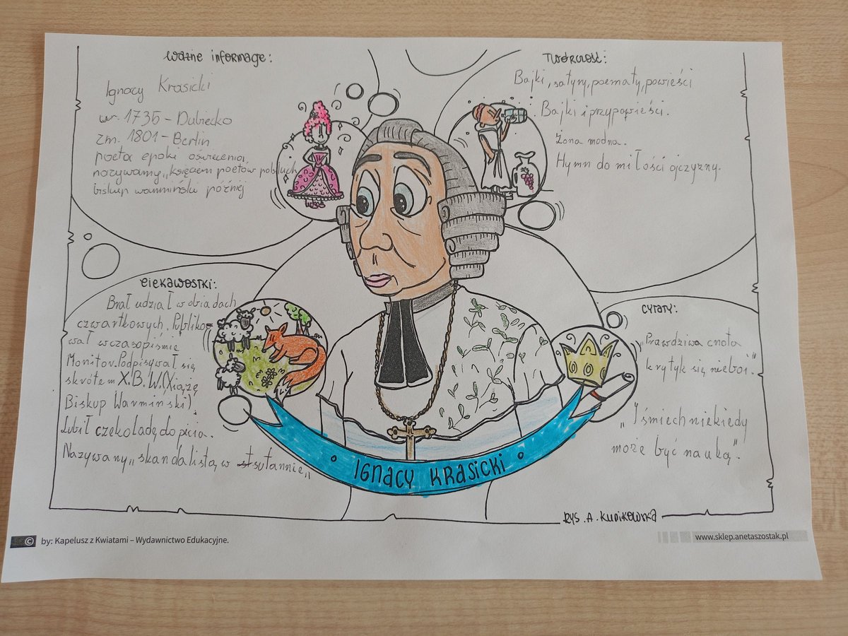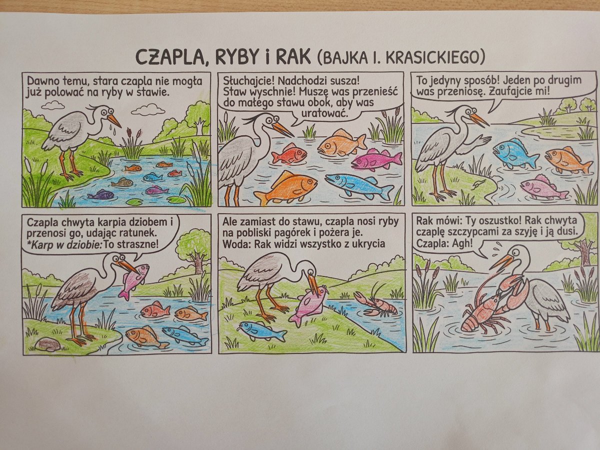 Uczniowie klasy V poznawali, natomiast, sylwetkę Ignacego Krasickiego – jednego z najwybitniejszych twórców polskiego oświecenia. Podczas zajęć zapoznali się z jego biografią, a następnie uzupełnili karty pracy zawierające najważniejsze informacje oraz ciekawostki z życia pisarza. Wykonali również sketchnotkę podsumowującą zdobytą wiedzę. Piątoklasiści dowiedzieli się, czym jest satyra i bajka oraz zrozumieli, że pozornie proste i zabawne utwory, w których bohaterami są zwierzęta, w rzeczywistości stanowią trafny komentarz do ludzkich zachowań i wad społeczeństwa. Uczniowie z dużym zainteresowaniem wysłuchali bajek Krasickiego – szczególnie spodobała im się animowana interpretacja utworu „Czapla, ryby i rak”, która wzbudziła wiele radości i śmiechu. Poznali także fragmenty satyry „Żona modna”. Podczas pracy z tekstem uczniowie interpretowali wybrane cytaty, zastanawiając się m.in. nad tym, co oznacza „umieć być przyjacielem”, czy chwalenie się zawsze świadczy o czyjejś wartości oraz co autor miał na myśli, porównując człowieka do dzwonu. Rozmowy te stały się okazją do refleksji nad codziennymi postawami i relacjami międzyludzkimi. W ramach zadania twórczego uczniowie przygotowali komiksy inspirowane bajką „Czapla, ryby i rak”. Wykorzystali do tego aplikacje oparte na sztucznej inteligencji, dzięki czemu mogli w ciekawy i nowoczesny sposób przedstawić treść utworu, który szczególnie przypadł im do gustu.